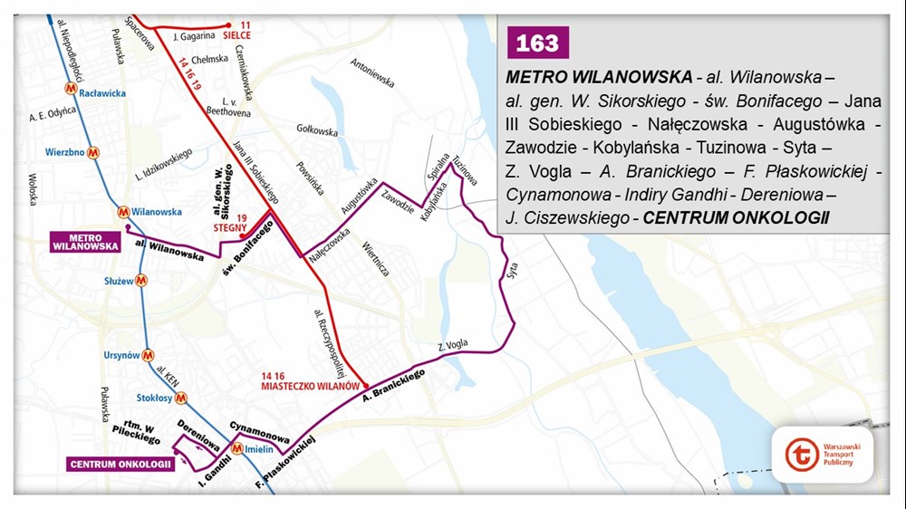 163: METRO WILANOWSKA – al. Wilanowska – al. gen. W. Sikorskiego – św. Bonifacego –Jana III Sobieskiego – Nałęczowska – Augustówka – Zawodzie – Kobylańska – Tuzinowa – Syta – Z. Vogla –A.Branickiego – F. Płaskowickiej – Cynamonowa – Indiry Gandhi – Dereniowa – J. Ciszewskiego – CENTRUM ONKOLOGII (powrót: rtm. W. Pileckiego – Indiry Gandhi)