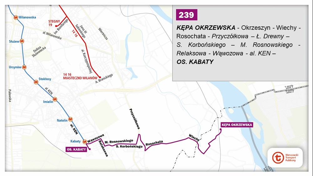 LINIA 239 Obecną trasę linii 239 przejmie linia 192, a 239 zastąpi w Wilanowie obecną linię 264. Autobusy 239 razem ze 139 będą obsługiwały osiedle Powsin (wzdłuż ulicy Przyczółkowej), a następnie przez ulicę S. Korbońskiego pojadą do stacji metra na Kabatach. Na wspólnym odcinku linie 139 i 239 będą oferowały łącznie częstotliwość kursowania co 15 minut. Połączenie Powsina z Wilanowem oraz przez al. Wilanowską ze stacją metra Wilanowska oferować będą linie 251 i 519. W kursach szkolnych autobus 239 dojedzie do przystanku Waflowa.