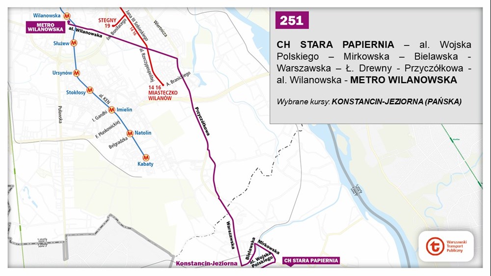 251: CH STARA PAPIERNIA – al. Wojska Polskiego – Mirkowska – Bielawska – Warszawska – Ł. Drewny – Przyczółkowa – al. Wilanowska – METRO WILANOWSKA