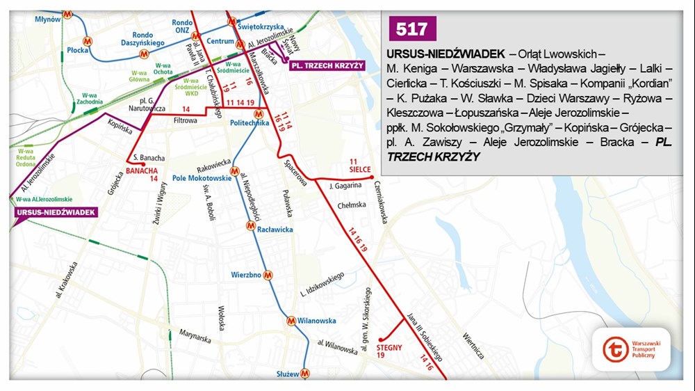 517: URSUS-NIEDŹWIADEK – Orląt Lwowskich – M. Keniga – Warszawska – Władysława Jagiełły – Lalki – Cierlicka – T. Kościuszki – M. Spisaka – Kompanii „Kordian” – K. Pużaka – W. Sławka – Dzieci Warszawy – Ryżowa – Kleszczowa – Łopuszańska – Aleje Jerozolimskie – ppłk. M. Sokołowskiego „Grzymały” – Kopińska – Grójecka – pl. A. Zawiszy – Aleje Jerozolimskie – Bracka – PL. TRZECH KRZYŻY (powrót: Nowy Świat)