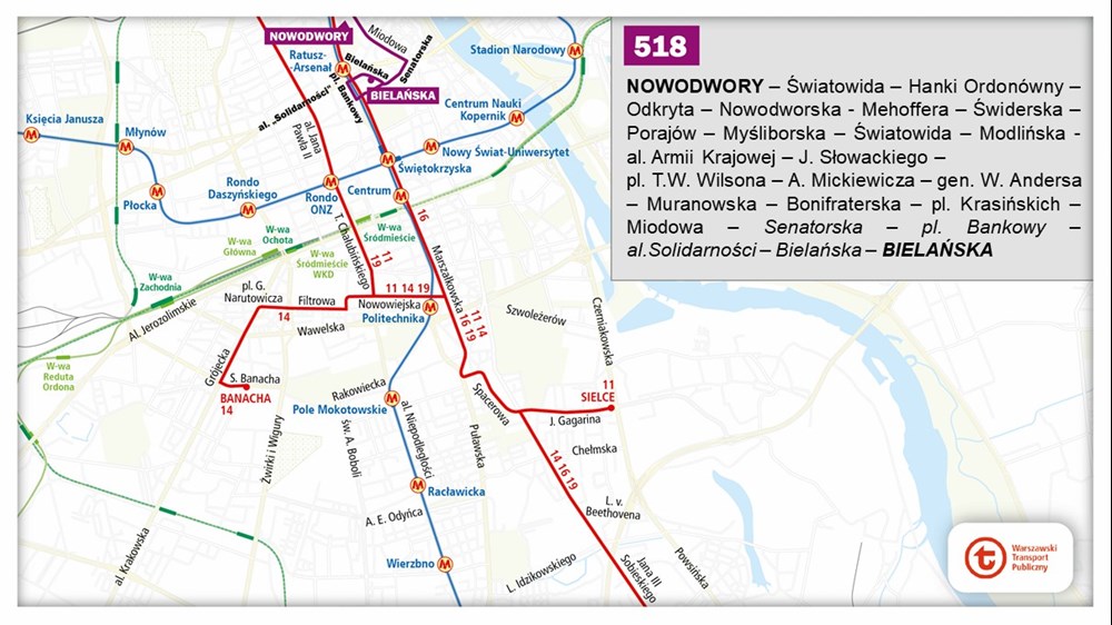 LINIA 518 Wprowadzona zostanie niewielka korekta trasy linii 518 w Śródmieściu, której rola w obsłudze połączenia zachodniej Białołęki z centrum jest niewielka (podstawowo połączenie to zapewniają tramwaje i autobusy z przesiadką do linii metra M1).