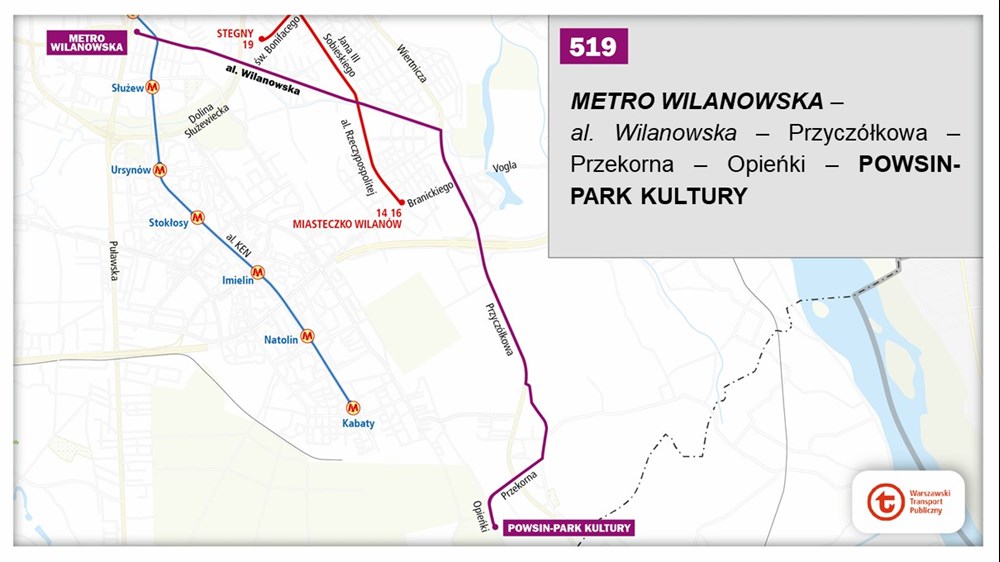 519: POWSIN-PARK KULTURY – Opieńki – Przekorna – Przyczółkowa – al. Wilanowska – METRO WILANOWSKA
