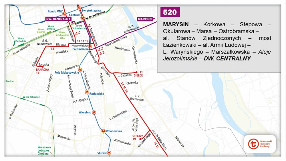 520: MARYSIN – Korkowa – Stepowa – Okularowa – Marsa – Ostrobramska – al. Stanów Zjednoczonych – most Łazienkowski – al. Armii Ludowej – L. Waryńskiego – Marszałkowska – Aleje Jerozolimskie – DW. CENTRALNY