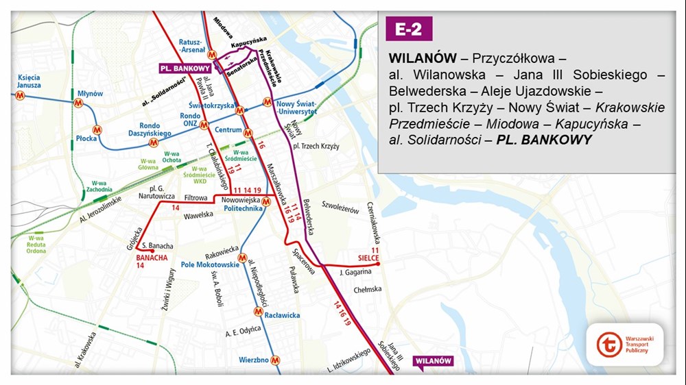 LINIA E-2 Warszawski ZTM przewiduje, że większość pasażerów podróżujących ulicą Jana III Sobieskiego wybierze połączenia tramwajowe, dlatego autobusy linii E-2 będą kursowały jedynie w szczycie porannym, kiedy liczba pasażerów jest największa. Autobusy E-2 zapewnią bezpośredni dojazd z Wilanowa i Dolnego Mokotowa aż do pl. Zamkowego. Przez cały tydzień bez zmian będą kursowały autobusy linii 116.