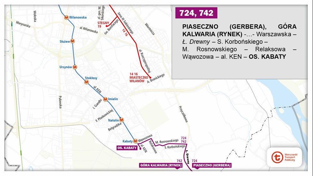 LINIE 724 i 742 Wprowadzone zostanie niewielkie skrócenie tras linii 724 i 742 aby przyspieszyć dojazd do stacji metra mieszkańcom miejscowości podwarszawskich. Bezpośrednie połączenie Powsina (ulicy Przyczółkowej) z najbliższą stacją metra (Kabaty) zapewnią autobusy linii 139 i 239.