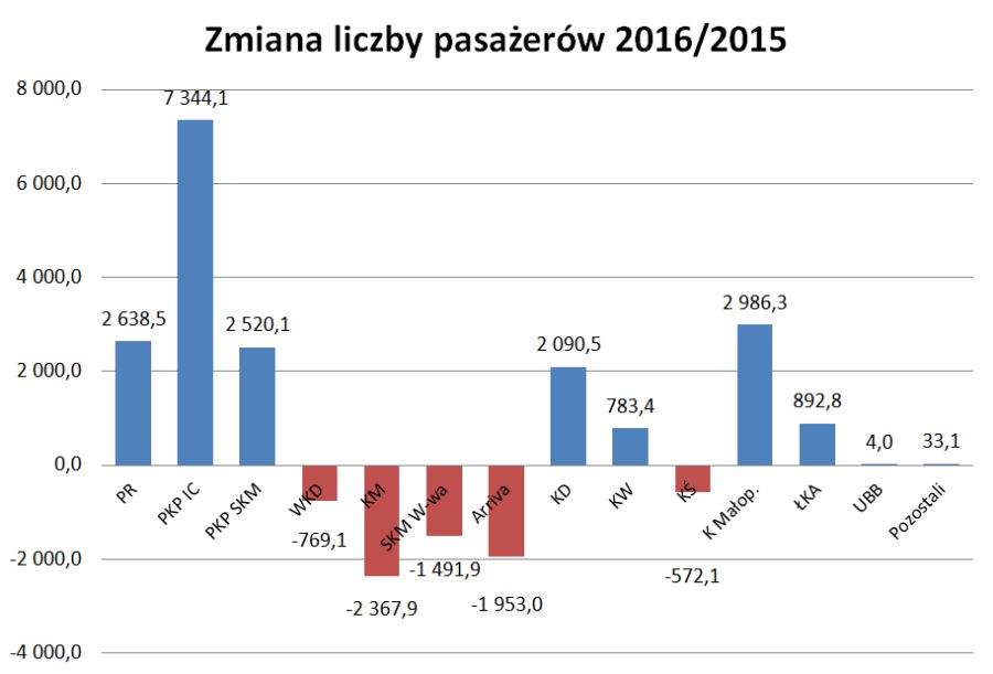 – Wymienione uwarunkowania znalazły odzwierciedlenie w wielkości przewozów w ujęciu miesięcznym. Wzrost liczby przewiezionych pasażerów odnotowano tylko w jednym miesiącu – grudniu 2016 roku, natomiast w trzech miesiącach – lipcu, sierpniu i listopadzie przewozy ukształtowały się na zbliżonym poziomie w porównaniu z analogicznymi okresami 2015 roku – podaje Kulesza.