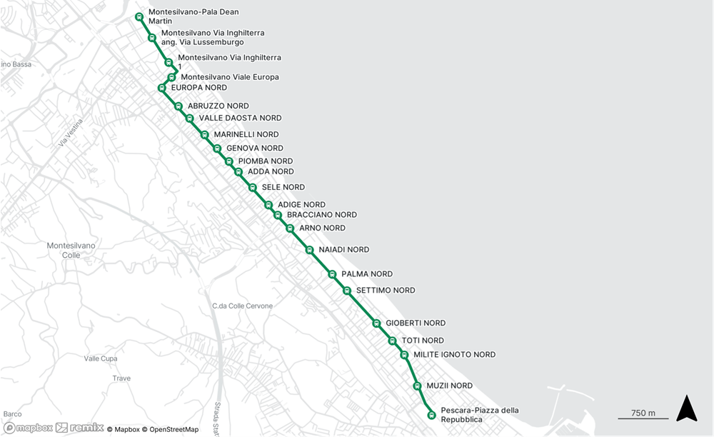 Budowa sieci ruszyła w 2009 roku i napotkała na swej drodze chociażby protesty mieszkańców przed ingerencją i oszpeceniem krajobrazu miasta. Udało się jednak projekt doprowadzić do końca i trasa liczy dziś 8 kilometrów długości. Większość trasy, bo na długości ok. 6 km, jest wydzielona i niezależna od ruchu innych pojazdów oraz z priorytetem dla trolejbusów. Sieć trakcyjna znajduje się nad prawie całością trasy – poza krańcówkami. Trolejbusy poruszają się z częstotliwością co 10 minut w dni powszednie w godzinach od 6:05 do 20:45 w kierunku Montesilvano i od 6:35 do 21:15 w kierunku Pescary. W weekendy kursowanie pojazdów ustalono od 7:00 do 21:00 w obu kierunkach co pół godziny.