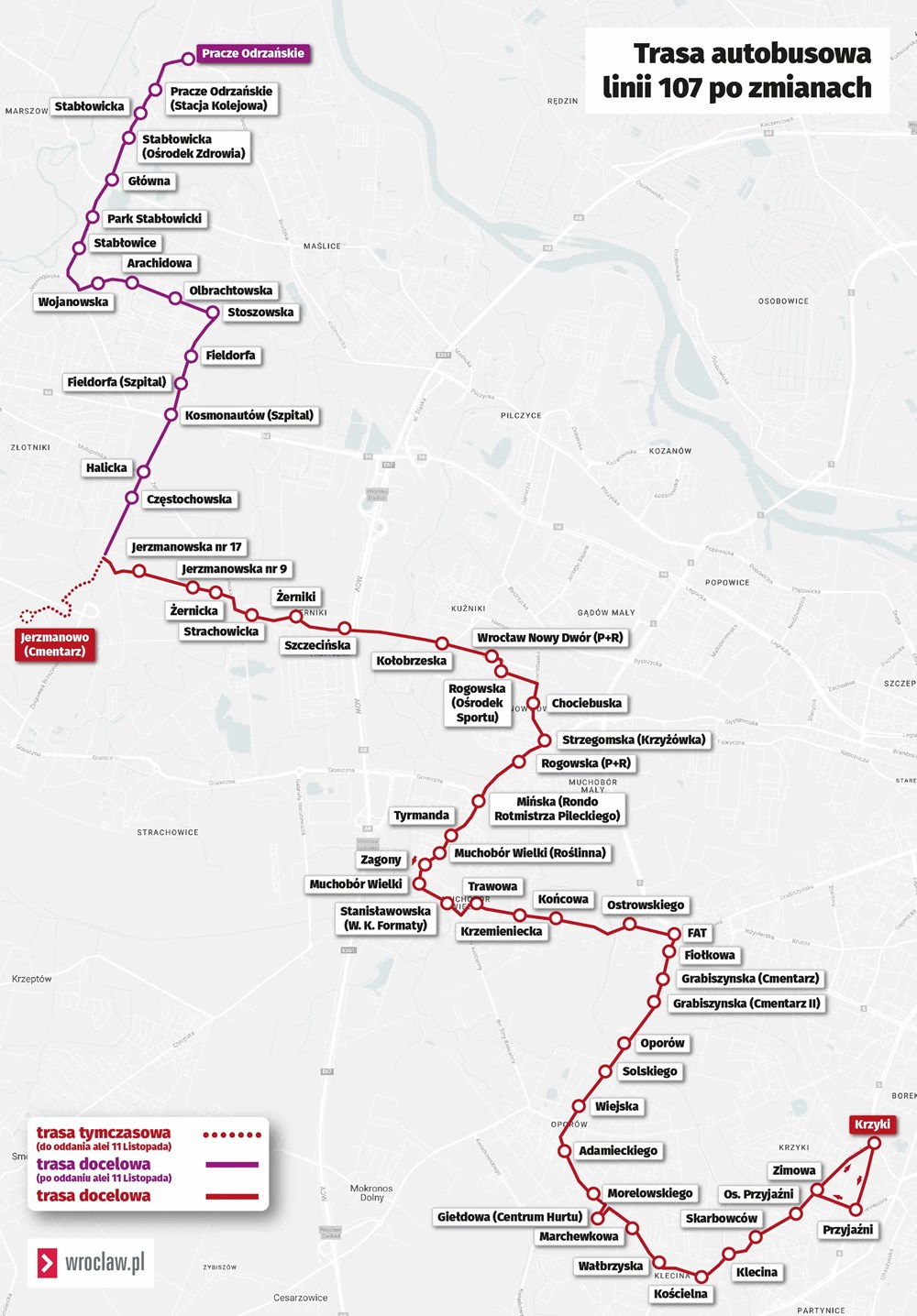Mapa przedstawia dotychczasową trasę autobusu 107 oraz tę, która będzie obowiązywać od 11 listopada (graf. www.wroclaw.pl)