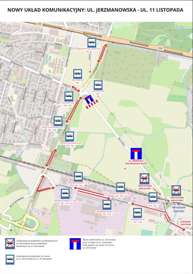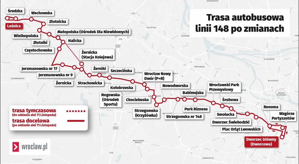 Linia 148, która obsługuje m.in. mieszkańców Żernik, Złotnik i Leśnicy, nie będzie kursowała ul. Żernicką przez tory kolejowe. Przed nimi zjedzie w Jerzmanowską, z niej w ul. 11 Listopada, przejedzie nad torami, na rondzie skręci w Halicką i Małopolską pojedzie starą trasą przez Złotniki na Leśnicę.