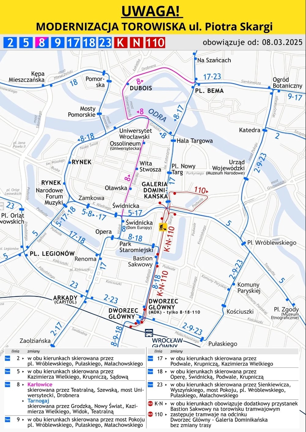 Dodatkowo, od 8 marca autobusy jadące ulicą Piotra Skargi od ulicy Teatralnej do placu Dominikańskiego w obu kierunkach będą poruszały się jezdnią - nie wjadą na pas autobusowo-tramwajowy. Linie K i N będą się zatrzymywały z kolei na przystankach Bastion Sakwowy (w kierunku Galerii Dominikańskiej nr słupka 110222, w kierunku dworca Wrocław Główny nr słupka 110221). Linia 110 będzie pełniła rolę komunikacji zastępczej za tramwaje pomiędzy dworcem Wrocław Główny, a Galerią Dominikańską.