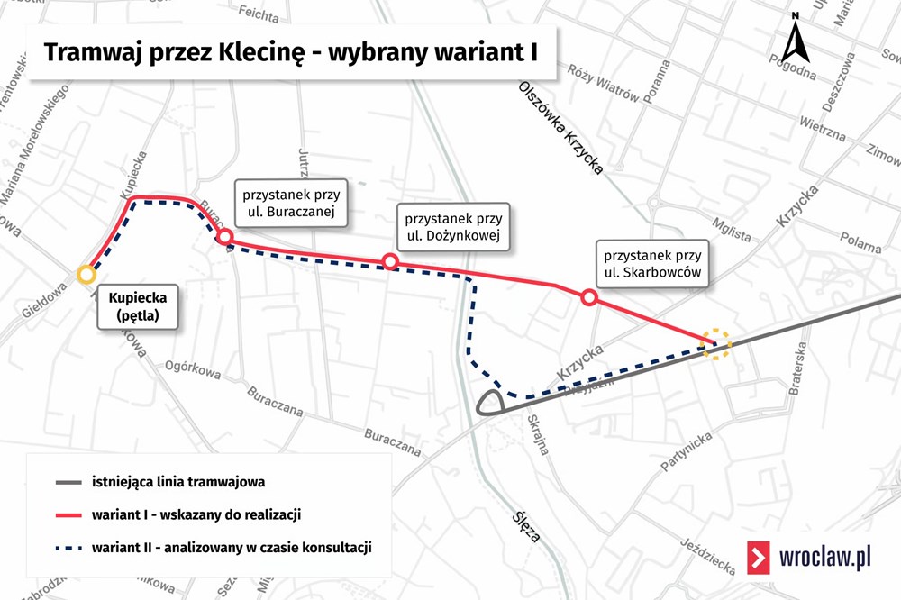 - Wariant 2 (społeczny): Przyjaźni, pętla Klecina, teren wzdłuż rzeki, nowy most przez rzekę Ślęża, przejście przez Dożynkową i Jutrzenki, wzdłuż Buraczanej, Kupiecka, pętla Kupiecka