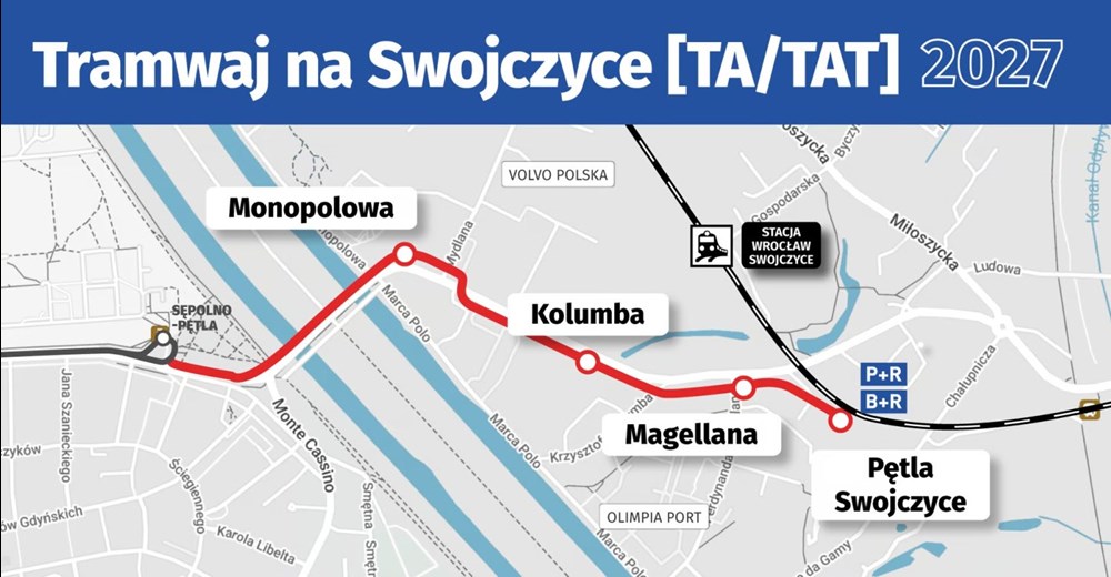 Dwie pętle, nowe przystanki i P&R Na nowej trasie przewidziano następujące przystanki: Sępolno (na wysokości obecnej pętli), Mydlana, Kolumba (w pobliżu stacji benzynowej), Magellana (przy centrum handlowym Swoja Olimpia) i Swojczyce (nowa pętla). Każdy z nich będzie dostosowany do potrzeb osób z niepełnosprawnością i wyposażony we wiatę oraz wyświetlacz Dynamicznej Informacji Pasażerskiej. W planach jest też wybudowanie punktów socjalnych dla motorniczych (Sępolno i Swojczyce) i kierowców (Sępolno).