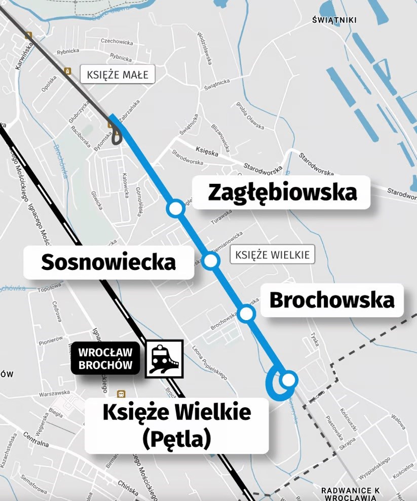 Wrocław ogłosił właśnie przetarg na wykonanie projektu nowej trasy tramwajowej na Księże Wielkie. Ten blisko 2-kilometrowy odcinek, będący wydłużeniem trasy do obecnej pętli Księże Małe miałby liczyć 4 przystanki wraz z pętlą końcową i miałby powstać do końca 2030 roku.