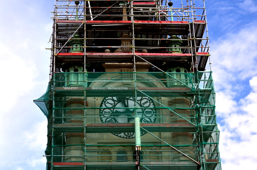 Wieża, choć jeszcze dziś otoczona rusztowaniami i siatką, nie jest jedynym miejscem, gdzie prowadzone są intensywne prace budowlane. Wysokie rusztowania, z których prowadzona jest renowacja, ustawiono wzdłuż elewacji zachodniej i południowej. Wewnątrz budynku wykonawca robót zakończył już prawie wszystkie prace rozbiórkowe. Szczególne wrażenie robi hala główna.