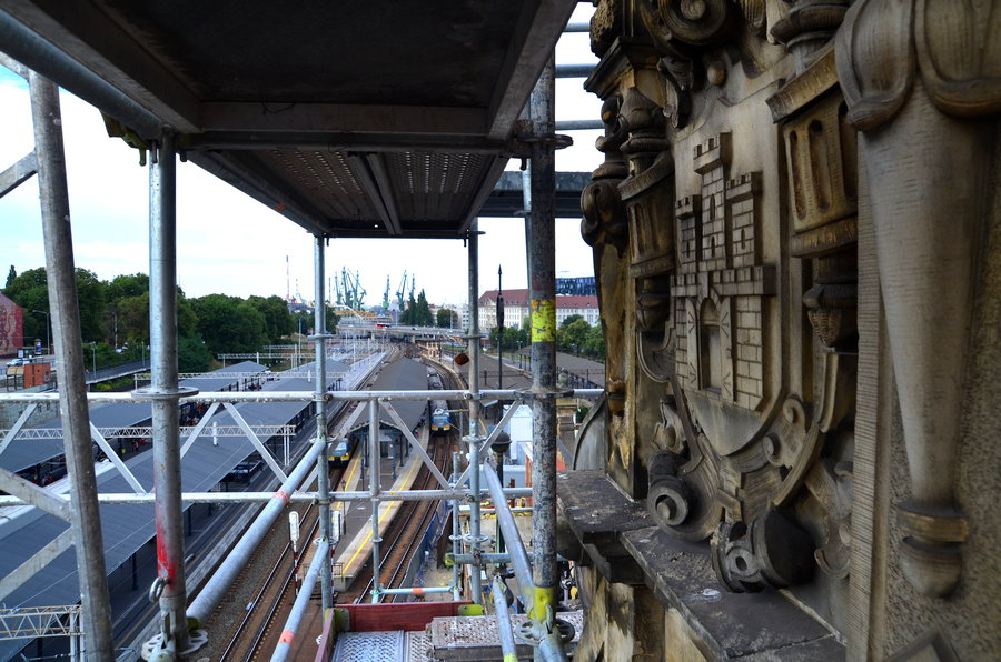 Elewacja prawie 50-metrowej wieży dworca Gdańsk Główny, dzięki przeprowadzonym pracom renowacyjnym, praktycznie odzyskała już swój dawny blask.