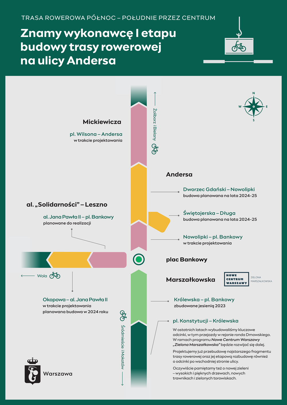 Rozstrzygnięty właśnie przetarg dotyczy ulicy Andersa na odcinku od rejonu Dworca Gdańskiego do skrzyżowania z ulicą Nowolipki. Równolegle trwa projektowanie II etapu, czyli od ulicy Nowolipki przez rejon stacji metra Ratusz-Arsenał aż do połączenia z placem Bankowym. W tym samym czasie powstaje również koncepcja ciągu dalszego wzdłuż ulicy Mickiewicza wraz z placem Wilsona. Łącznie to aż 3 kilometry międzydzielnicowej trasy prowadzącej wprost do Śródmieścia.