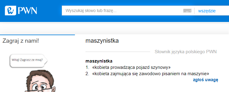 Wielkim słowniku języka polskiego. Po drugie, to, że wcześniejsze słowniki odnotowywały tylko jedno znaczenie maszynistki, wynikało bądź z przyjętych przez redakcje założeń leksykograficznych, bądź z faktu, że do niedawna zawód maszynisty wykonywali chyba tylko mężczyźni. Po trzecie wreszcie: skoro nazwa męska maszynista bez przeszkód funkcjonuje w kilku znaczeniach, to także bez przeszkód może w kilku znaczeniach funkcjonować – i zresztą już to się dzieje – maszynistka – komentuje Agata Hącia z poradni językowej Uniwersytetu Warszawskiego.