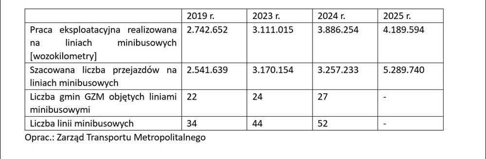 Jeszcze w 2019 r. w GZM linii minibusowych było 34, a autobusy na nich kursujące pokonały około 2,7 mln kilometrów na obszarze 22 gmin. W 2024 r. linii minibusowych było już 52, a autobusy przejechały na nich ok. 3,9 mln kilometrów w 27 gminach. W każdej z tej kategorii widać tendencję wzrostową – o kolejno 53%, 42% i 23%.