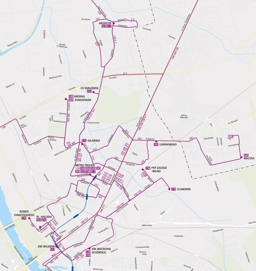 linię E-7. Trasa: GRODZISK – L. Berensona – Oknicka – Lewandów – Głębocka –Toruńska – al. marsz J. Piłsudskiego – Radzymińska – Trocka – METRO TROCKA.